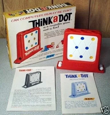 The Think-a-Dot was a mathematical toy made by E.S.R., Inc. during the 1960s that demonstrated group theory. It had eight coloured disks on its front, and three holes on its top - left, right, and center - through which a ball bearing could be dropped. Each disk would display either a yellow or blue face, depending on whether the mechanism behind it was tipped to the right or the left. The Think-a-Dot thus had 28=256 internal states. When the ball fell to the bottom it would exit either to a hole on the left or the right of the device.